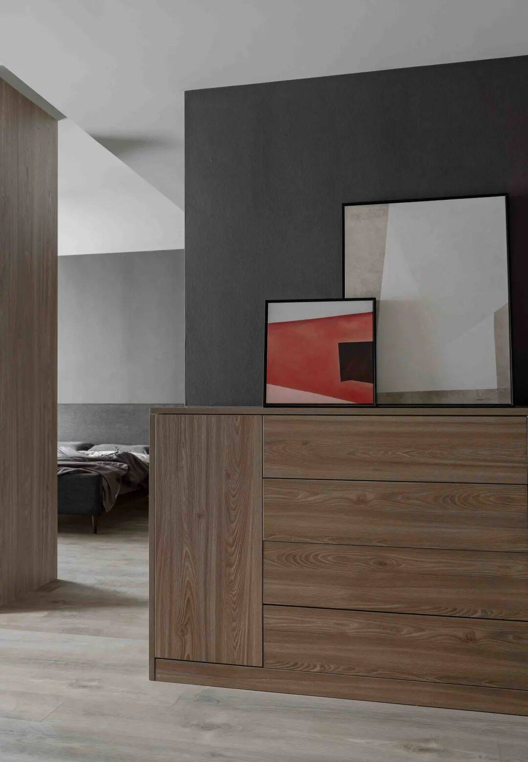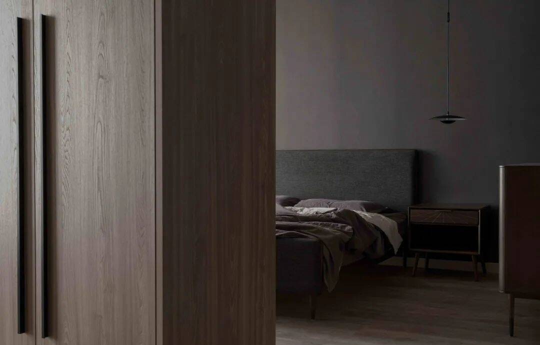▲主人房进门后进入后并不是马上步入床区,而是一个斗柜端景台,床铺区若隐若现的的视觉,增加了主卧空间的神秘与私密感。