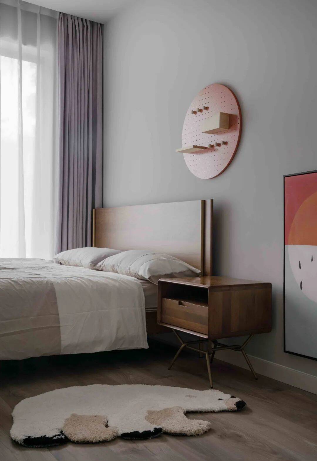 ▲儿童房空间不算大,靠窗位置摆上一张实木床,床旁边布置一个实木床头柜,后方墙面装一个圆形的粉色洞洞板收纳架,地面布置北极熊造型的地毯,搭配简约淡雅的床单,让空间显得舒适童趣而自然。