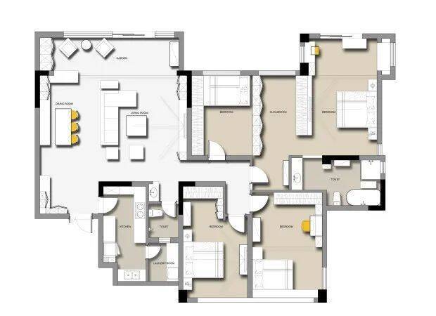 ▲床尾贴着衣柜底部,因此把衣柜门装在比较高的区域,避免影响衣柜门的开启,床头从灰色-卡其色-白色这样的渐变色过渡,也为我们呈现出了一种简约大方的舒适氛围感。