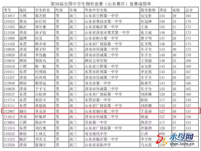 水母网9月27日讯(通讯员 陈珍珍)2021年9月21日,第38届全国中学生物理竞赛(山东赛区)落下帷幕。烟台二中于显涛老师指导的高三年级李昊洋同学以全省总排名第42名的好成绩荣获全省一等奖,在烟台市所有参赛选手中,理论成绩、实验成绩和总成绩均为最高;高三年级徐阳、杨宗凡、朱勃帆、商展赫四位同学荣获二等奖,高二年级王鲁顺老师指导的袁令澍同学获得二等奖,徐启然,寇新宇,林飛宇同学获得三等奖。烟台二中以优异成绩再次荣获“全国中学生物理竞赛金牌学校”!