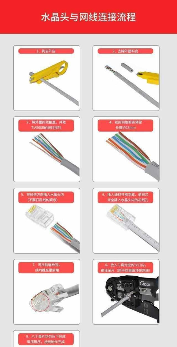 水晶头的制作要规范,常用TIA568A和TIA568B两种标准,我经常使用的是TIA568B标准,即线序为”橙白、橙、绿白、蓝、蓝白、绿、棕白,棕“;