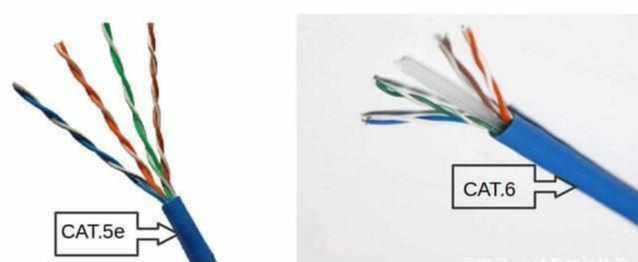 网线从外观上还是比较容易标识的,超五类网线表皮标有”CAT.5e"的字样,六类网线标有“CAT.6"的字样,并且有”十字骨架“,如下图所示。