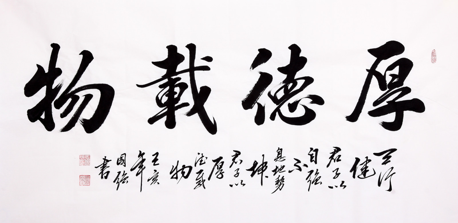 厚德载物书法告诉我们:大地的气势厚实和顺,君子应增厚美德,容载万物。大地承载万物,做人也要有广阔的胸怀,做到“宰相肚里能撑船”, 尽可能地去原谅别人,能够真正做到古代圣贤所说的“以德报怨”、“以直报怨”。