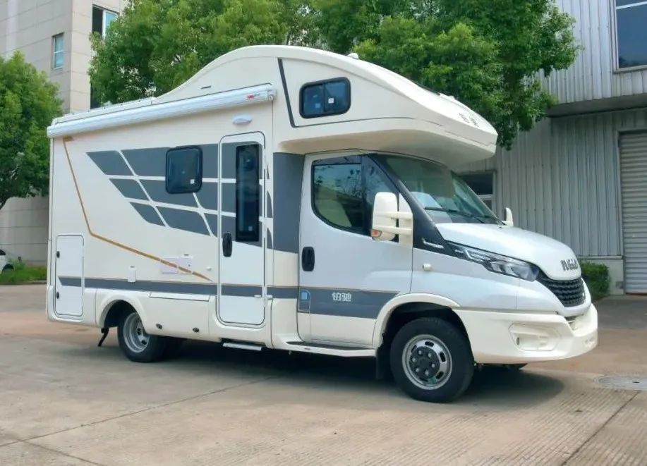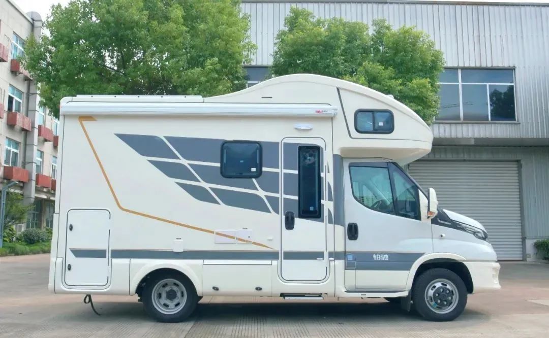 车身外部配备了房车专用乘客门、外置车载脉冲式柴油灶、菲亚玛遮阳棚、LED户外照明灯、市电接口、自吸加水口、进口电动踏步、外接10米电源线、外接20米水管等设施;进门处设有鞋柜方便更换鞋具;
