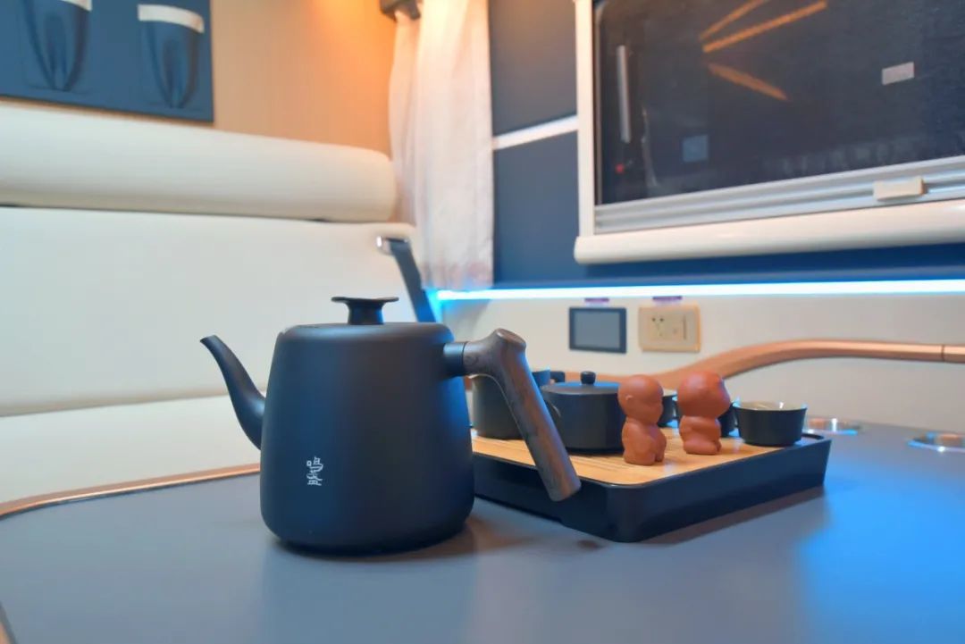 卡座中间设有分节式升降餐桌,可供车上人员餐饮、休闲娱乐、办公等使用;桌板上带有两个杯托,有效防止行车中杯子跌落;