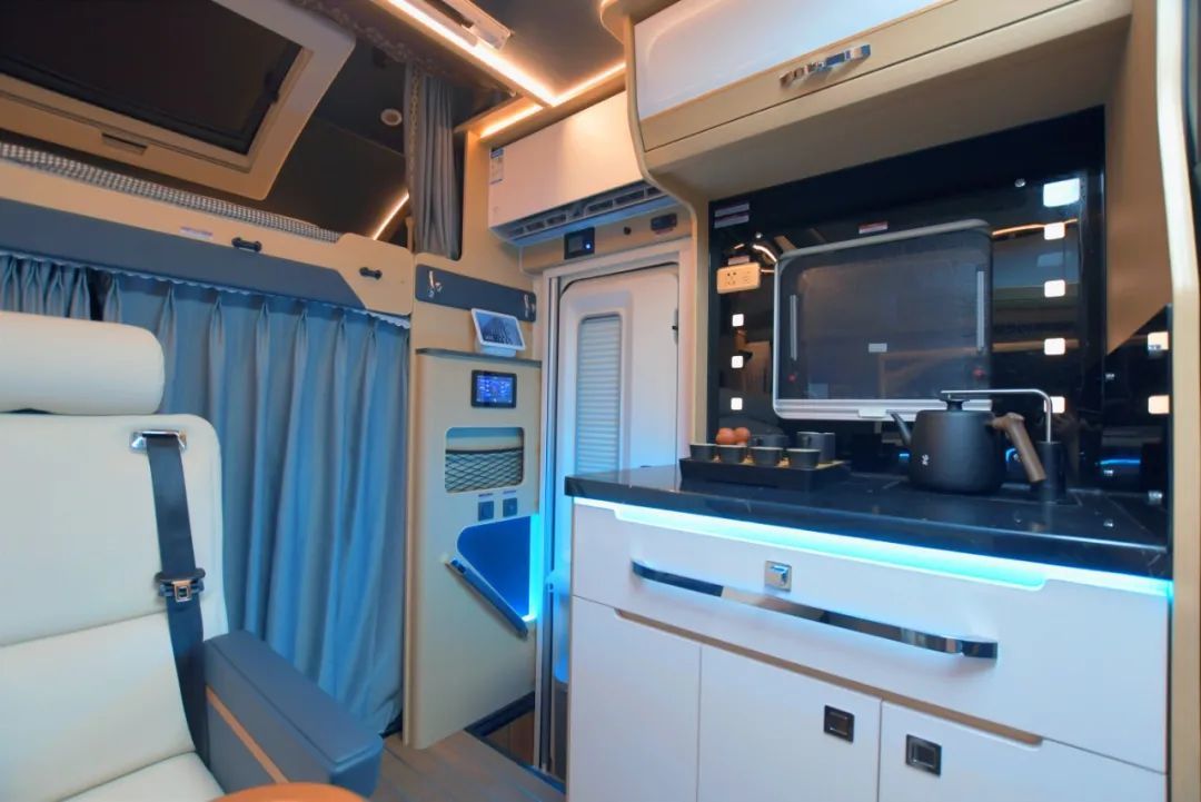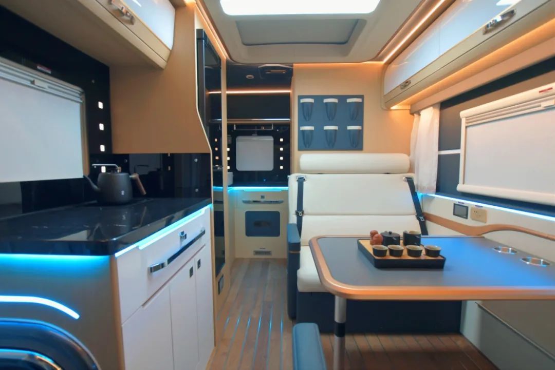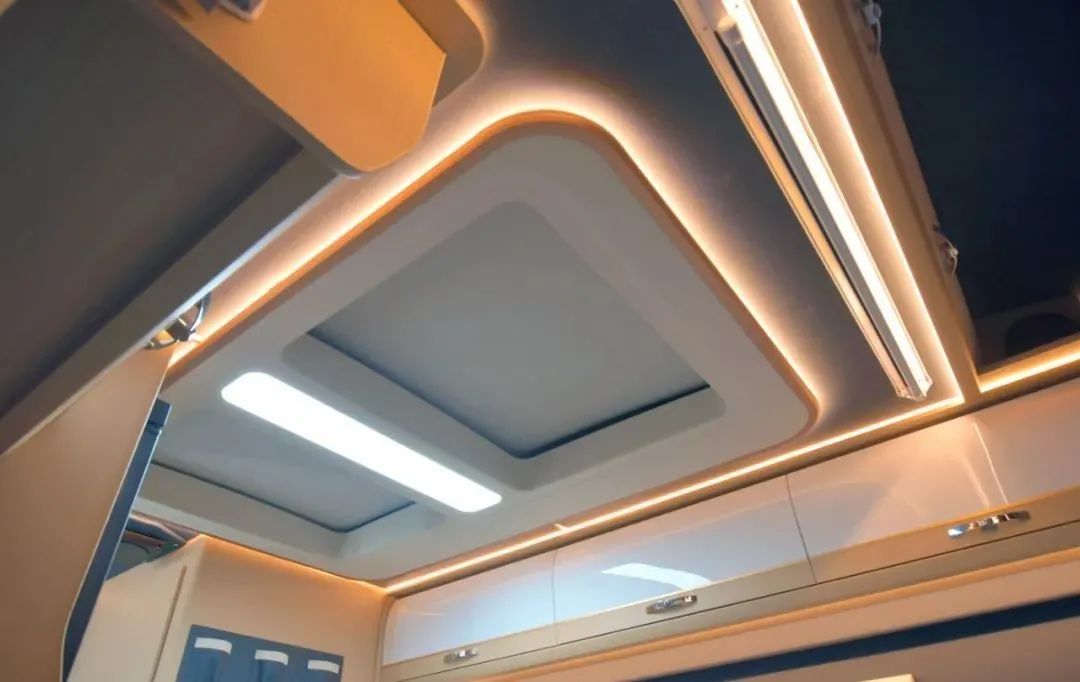 会客区顶部同样亮点十足,奔驰V级全景天窗,国内首家在房车上使用,豪华感拉满;