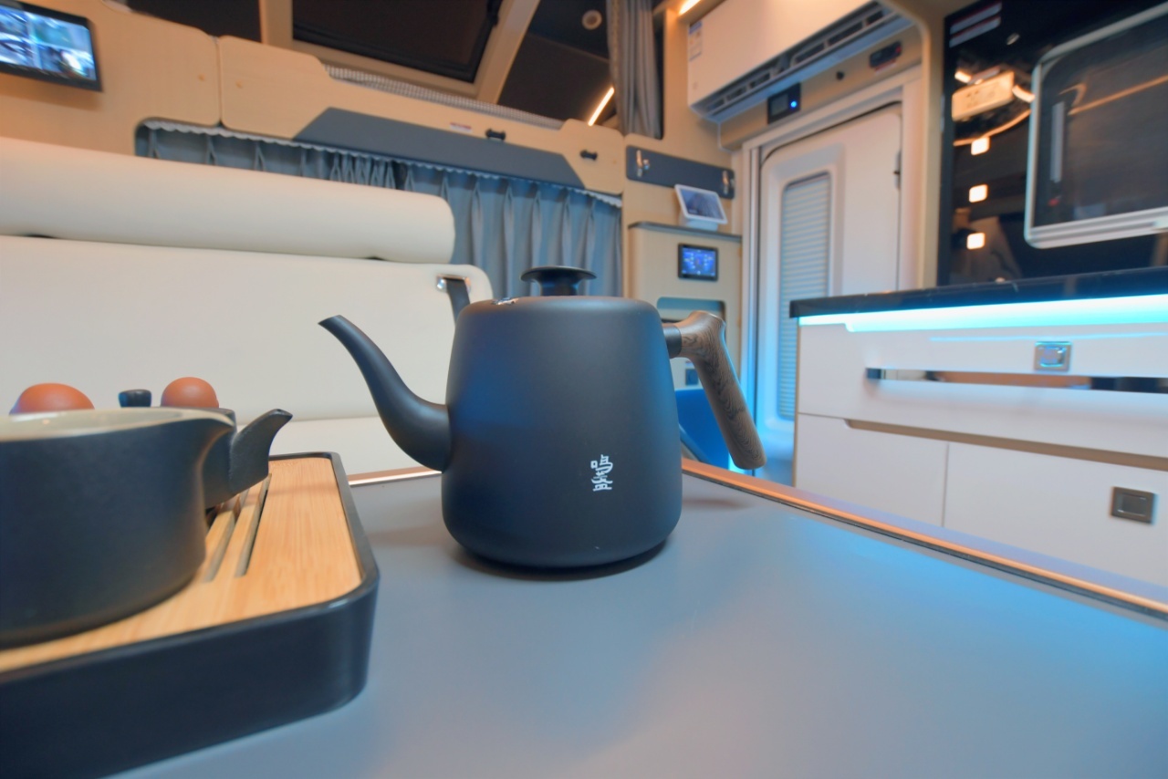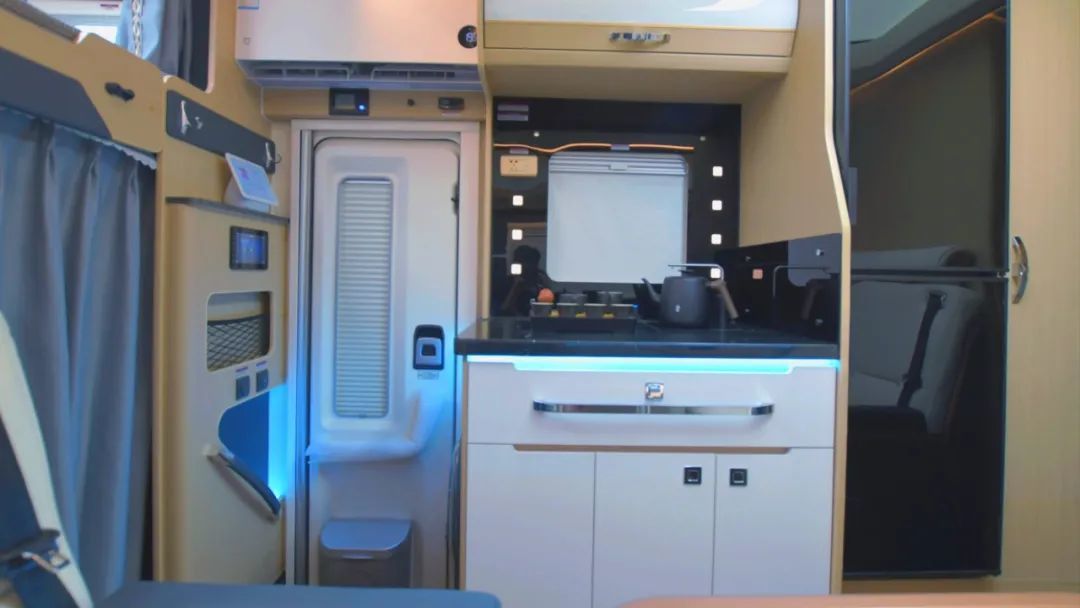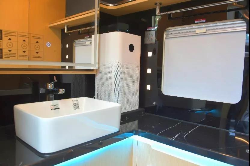 尾部洗漱区同样采用豪华大理石台面,并配置了科勒洗漱池、科勒镜柜、科勒水龙头、小米空气净化器等设施;卫生间则是在另一侧,采用封闭式设计,内部配置了花洒套装、赛特福德旋转式坐便器、照明灯、MAX换气扇等设施;干湿分离,充分满足车上人员卫浴洗漱的需求;