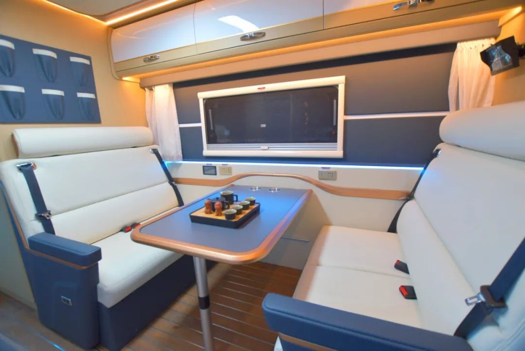 会客区设有奢华商务风对座卡座,卡座带有扶手、安全带方便行车时载人;