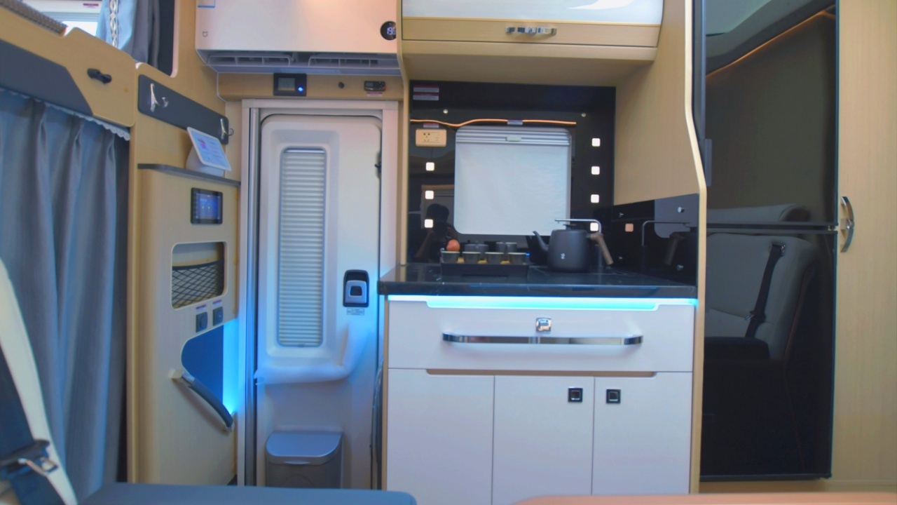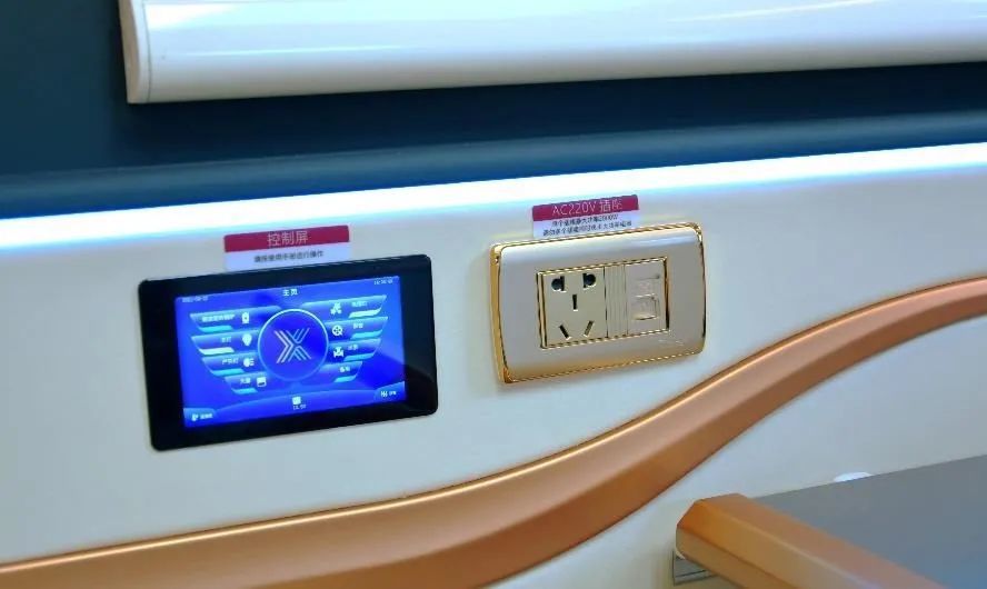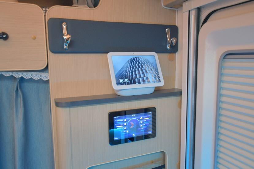 车内搭载全套小米智能家居,其中触屏版AI小爱音响位于主门内侧,带有语音智能控制功能,让生活更便利,旅居更舒心;下方是车内集成电器控制面板,可实时监测、控制车内水电;