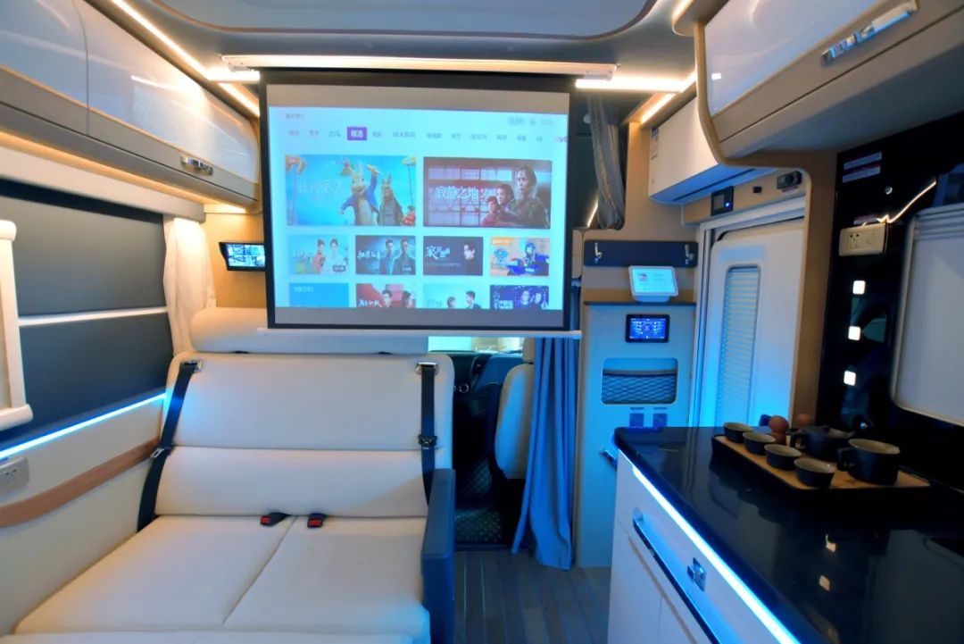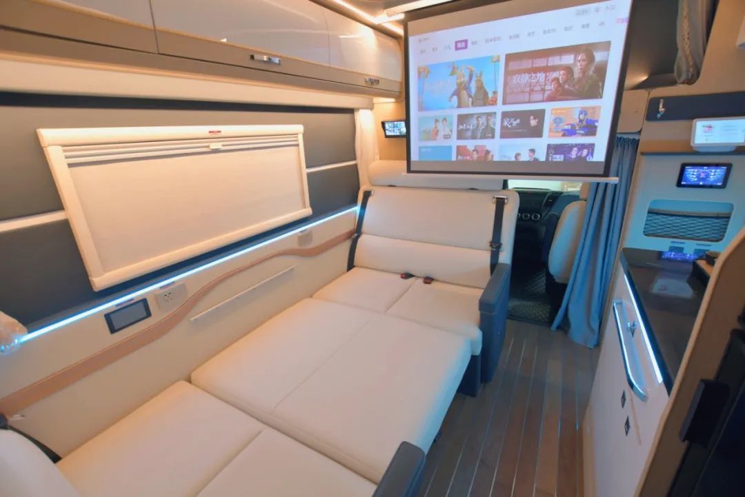 生活区内饰采用宝蓝色+皓月白的搭配,辅以玫瑰金饰条装饰,浓郁的商务风格扑面而来,同时软装处理过的侧墙也使豪华感、舒适度进一步提升;生活区前部设有极米4K投影,50寸超大观影幕布,搭配车内带有独立功放的JBL音响(可单独连接蓝牙),随时随地享受影院级的观影体验;