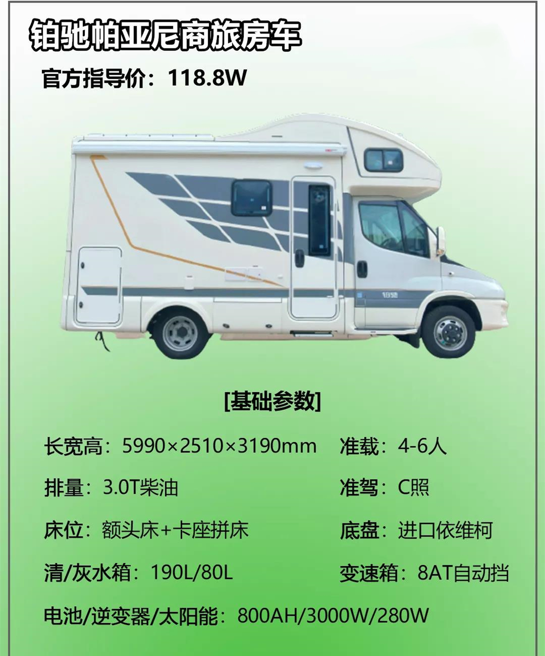 2022款铂驰进口帕亚尼,豪华商旅C型无拓展房车,车身外尺寸为5989x2521x3188mm,核载4-6人,上蓝牌,C照可驾驶;另外,新车由意大利设计师携手铂驰设计团队倾心打造,意式风格,商务做工,并赋予它全新的外观;车身免漆,并在两侧配有天使之翼车身拉花,当然也有其他外观版本可供选择,车身易清洁,整体看起来也更加平整、美观;