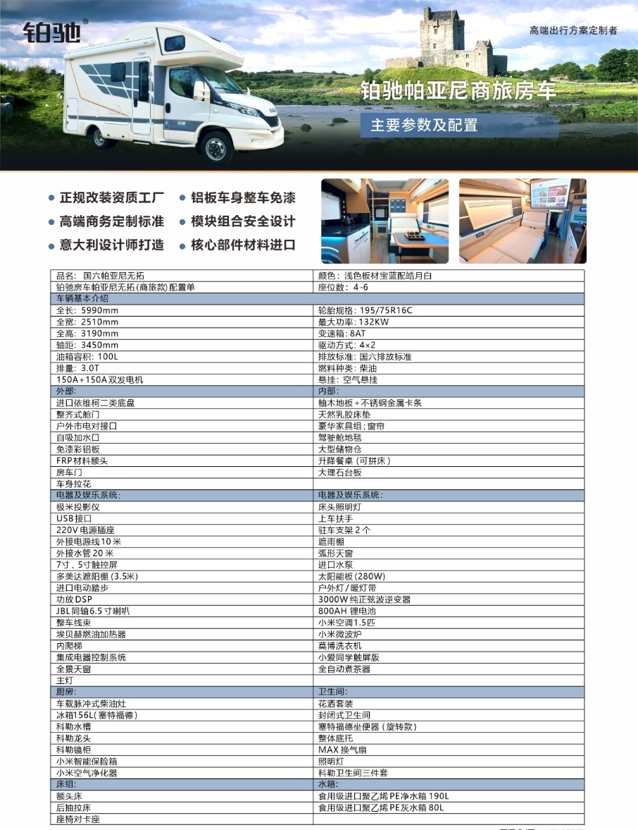 2022款铂驰进口帕亚尼房车,豪华商旅C型无拓展,意大利进口依维柯底盘,空气悬挂+底盘升降系统,8速手自一体变速箱,与众不同的商务布局,兼具商务出行、家庭旅行两大特性,全国首发!