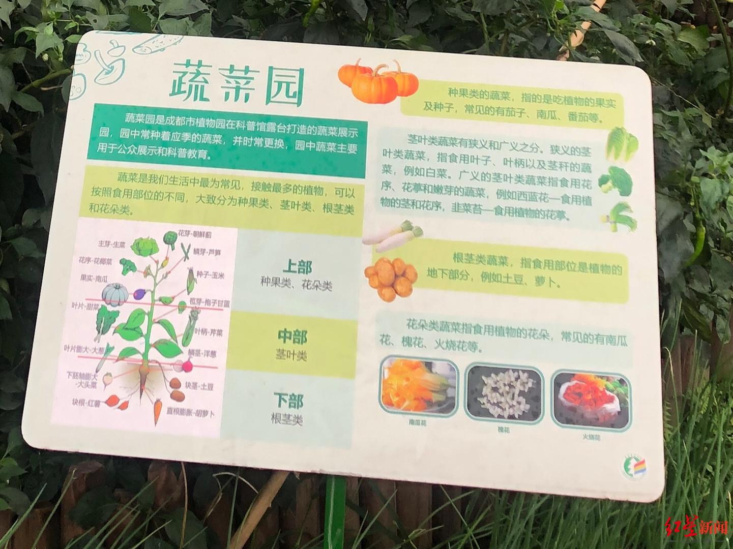 蔬菜园的解说牌介绍说,按照食用部位的不同,大致分为种果类、茎叶类、根茎类和花朵类。种果类的蔬菜,主要食用的是果实及种子,常见的有茄子、南瓜、番茄等。茎叶类蔬菜有狭义和广义之分:狭义的主要食用的是叶子、叶柄及茎秆,例如白菜;广义的主要食用的是花序、花葶和嫩芽,例如西蓝花——食用植物的茎和花序,韭菜苔——食用植物的花葶。根茎类蔬菜,主要食用的是地下部分,例如土豆、萝卜。花朵类蔬菜,主要食用的是花朵,常见的有南瓜花、槐花、火烧花等。