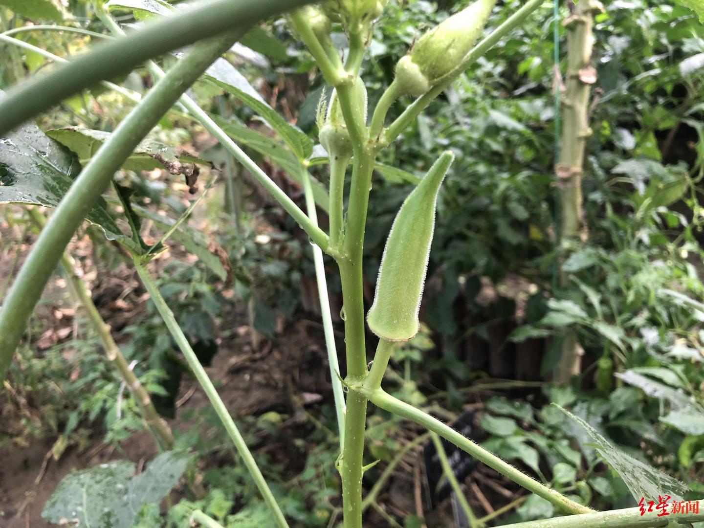26日下午,一场阵雨突然来袭。雨停后,植物园里的植物更显新鲜,就像菜市场里刚洗过的蔬菜一样。园内科普馆的露台上,一块20平方米左右的菜地,既有绿油油的葱和韭菜,还有几根收获后留下的丝瓜和茄子。其中最好的要属秋葵。几株一米多高的植株,秋葵像一座尖塔般矗立在枝干伸出的底座上,表面还包裹着一层水膜。