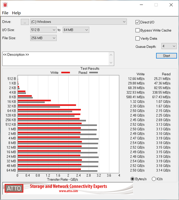 在512字节到64兆数据包的连续读写性能的基准测试中,成绩同样优秀,尤其在4K数据读写方面,读取写入数据非常抢眼。