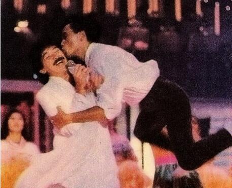 1985年林子祥开演唱会,唱《十分十二吋》,将哥哥的歌词"Thanks Monica"改成"Thanks Leslie",张国荣开心地在台上凌空跃起,飞上去就给了林子祥一记拥吻。