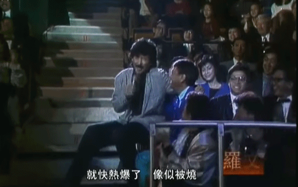 谭咏麟和一边林子祥斗歌,一边跳起了抖肩舞,被逼着合唱的洪金宝大喊“太疯狂”。