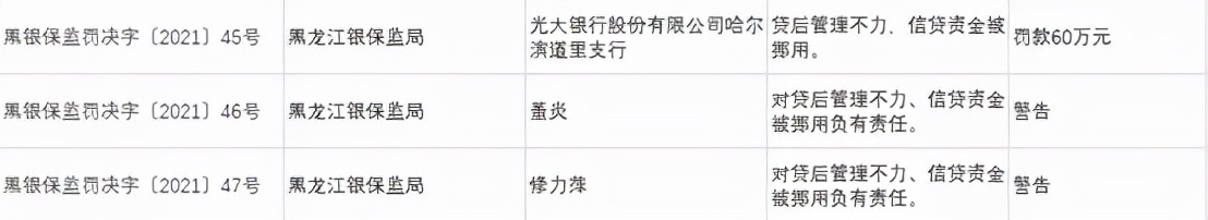 光大银行股份有限公司哈尔滨道里支行因贷后管理不力,信贷资金被挪用,被罚款60万元。董炎,修力萍对上述违规负有责任被予以警告处罚。
