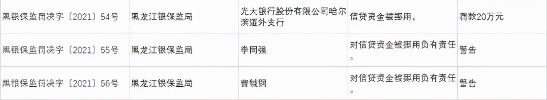 光大银行股份有限公司哈尔滨道外支行因信贷资金被挪用,被罚款20万元。李同强,曹铖钢对上述违规负有责任被予以警告处罚。