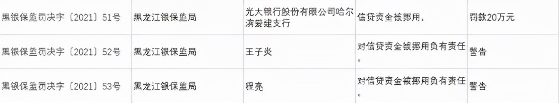 光大银行股份有限公司哈尔滨爱建支行因信贷资金被挪用,被罚款20万元。王子炎,程亮对上述违规负有责任被予以警告处罚。
