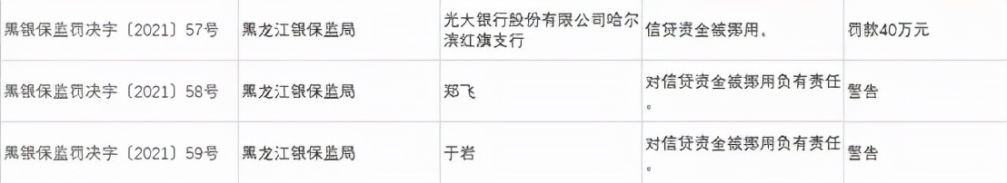 光大银行股份有限公司哈尔滨红旗支行因信贷资金被挪用,被罚款40万元。郑飞,于岩对上述违规负有责任被予以警告处罚。