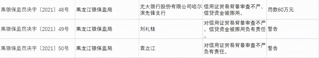 光大银行股份有限公司哈尔滨先锋支行因信用证贸易背景审查不严、信贷资金被挪用,被罚款60万元。刘礼桂,袁立江对上述违规负有责任被予以警告处罚。