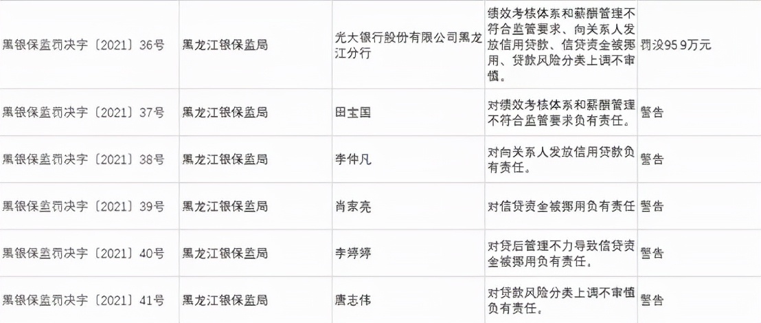 其中,光大银行股份有限公司黑龙江分行因绩效考核体系和薪酬管理不符合监管要求、向关系人发放信用贷款、信贷资金被挪用、贷款风险分类上调不审慎,被罚没95.9万元。田宝国,李仲凡,肖家亮,李婷婷,唐志伟对上述违规负有责任被予以警告处罚。