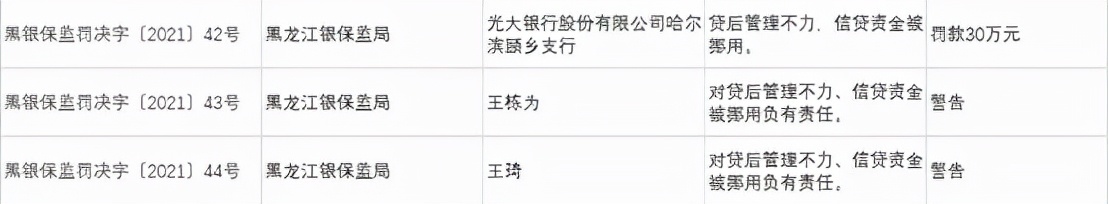光大银行股份有限公司哈尔滨顾乡支行因贷后管理不力,信贷资金被挪用,被罚款30万元。王栋为,王琦对上述违规负有责任被予以警告处罚。