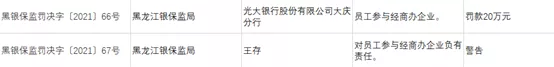 光大银行股份有限公司大庆分行因员工参与经商办企业,被罚款20万元。王存对上述违规负有责任被予以警告处罚。