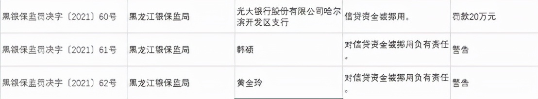 光大银行股份有限公司哈尔滨开发区支行因信贷资金被挪用,被罚款20万元。韩硕,黄金玲对上述违规负有责任被予以警告处罚。