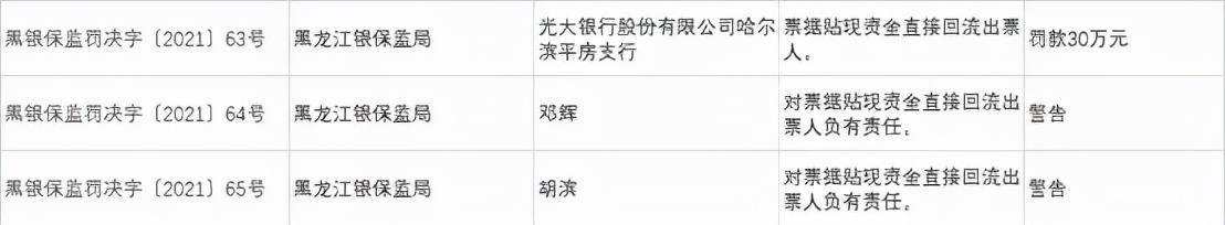 光大银行股份有限公司哈尔滨平房支行因票据贴现资金直接回流出票人,被罚款30万元。邓辉,胡滨对上述违规负有责任被予以警告处罚。
