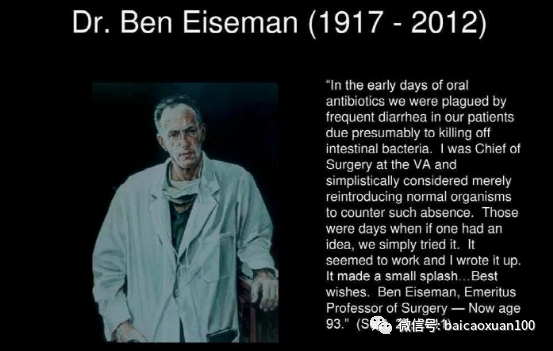 1958年美国科罗拉多大学医学院Ben Eiseman博士在治疗伪膜性肠炎过程中,在使用了所有常规治疗手段之后仍然不能奏效的情况下,尝试性的使用患者家属粪便制成的粪水进行灌肠,结果神奇般的治愈了3例垂危患者,这被认为是“粪菌移植”的一个开端。