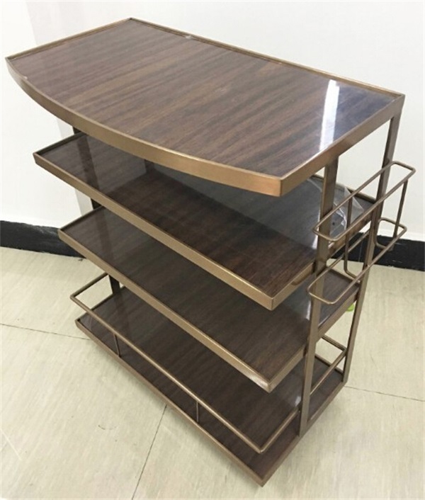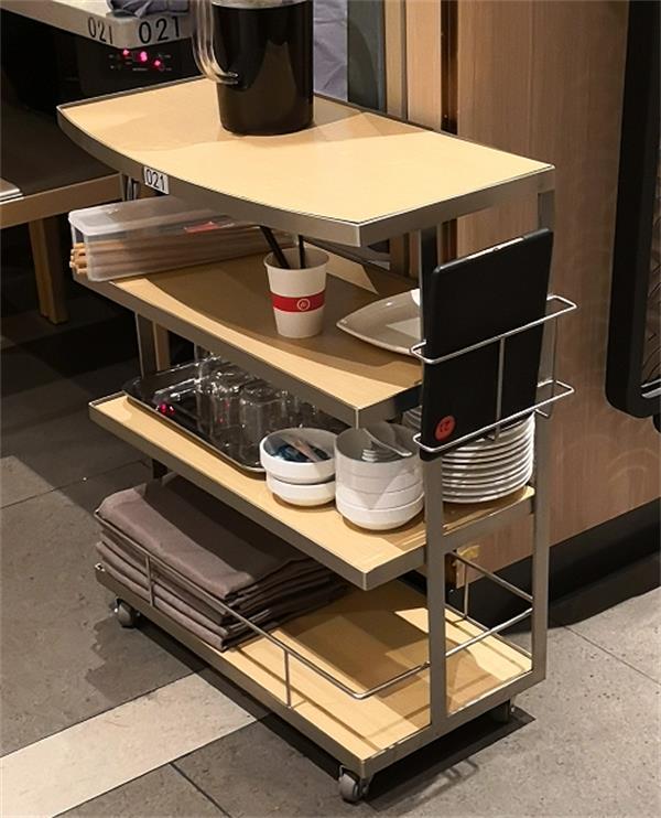 海底捞火锅不锈钢菜架材质:304不锈钢框架,菜架分为4层,每层层架上放一层木纹胶板。菜架颜色可以提供不同的颜色。底部带有刹车轮,更简单方便。