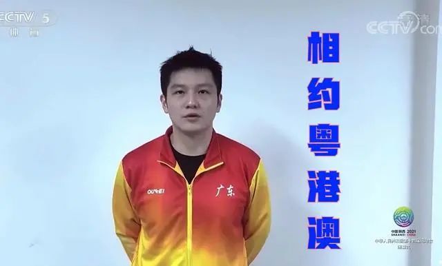 视频中,展现了广东、澳门和香港的地标建筑物,以及优秀运动员代表先后用粤语说出“相约粤港澳”,其中,第一个亮相的就是樊振东,他背着双手,神情庄重,满满诚意地说出“相约粤港澳”,用粤语寄语下一届的粤港澳全运会。