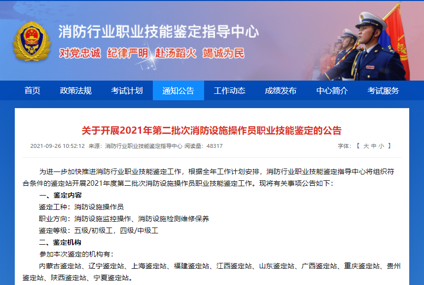 9月27日,山东、陕西、广西、重庆、江西、上海、内蒙古、辽宁、贵州、福建10地发布了2021年第二批次消防设施操作员职业技能鉴定公告。