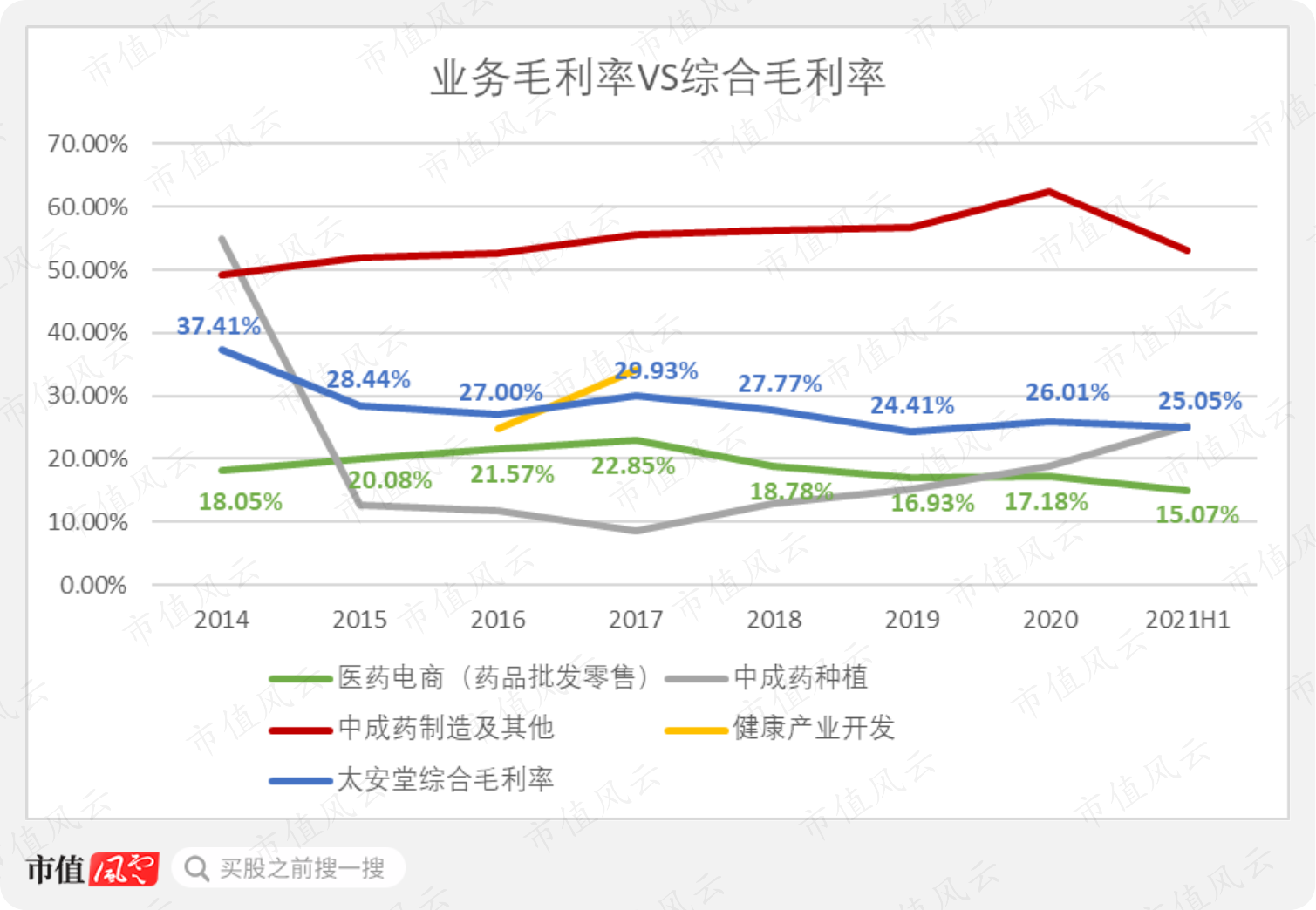 2021年上半年,太安堂的老本行、也是一向最赚钱的中成药制造业务,毛利率降幅明显,也成为同时期整体毛利率低于2014年的原因之一。
