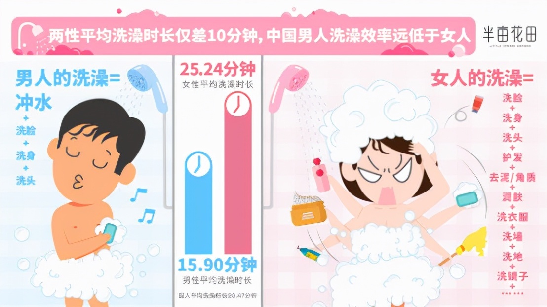 2019年半亩花田发布的《2019中国人洗澡大数据报告》指出,在洗澡这件事上,很多人似乎对女性有误解,凭印象认为男性洗澡快,女性则磨蹭。但中国人洗澡大数据报告却给出了真实原因:男性平均洗澡时长比女性少10分钟,洗澡效率却远低于女性。甚至有人调侃称,男人洗澡主要是冲水,女人洗澡则是“洗一切”的合集。从完整的洗澡步骤来看,搓泥或者搓磨砂膏已成为国内“洗澡精致派”的既定动作之一,和洗脸、洗身、洗头、护发、润肤一起组成了六大步。
