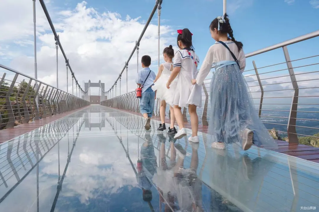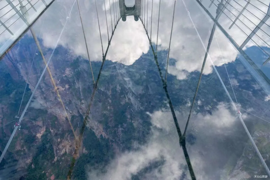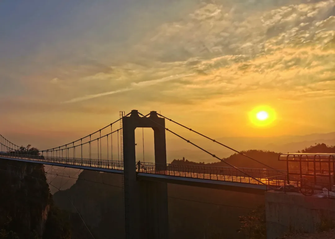 玻璃桥上映着天空的倒影,每当旭日东升或夕阳西下的时候,阳光洒落“会仙桥”,让葱郁的群山多了一丝温暖和鲜亮。玻璃桥上还有观景台,网红秋千,命运之环,彩虹吊椅,高空蹦床……身处高台往下看了一眼,不禁想起了《徐霞客游记》中的那句“下瞰深谭,毛骨俱耸”,忍不丁打了个寒颤,“心跳之旅”就此开启!