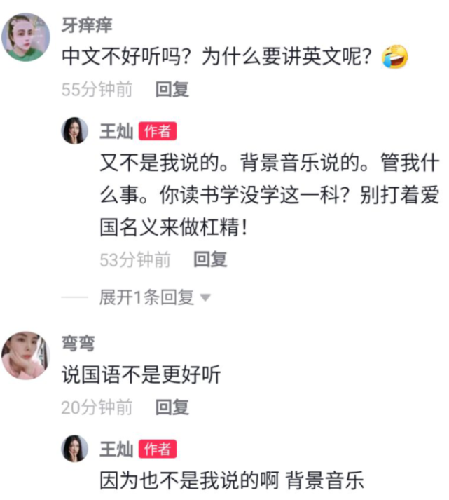 部分网友抓住“王灿说英语”这个点肆无忌惮地吐槽,暗戳戳讽刺王灿“崇洋媚外”。见此,王灿也颇为气愤,回怼:“又不是我说的,背景音乐说的,别打着爱国名义来做杠精。”