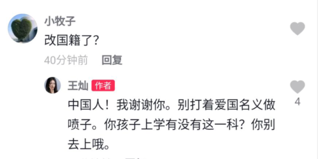 甚至还有网友直接质疑王灿改了国籍,对此,王灿怒怼道:“我是中国人!别打着爱国名气做喷子。你孩子上学有没有这一科?你别去上哦。”