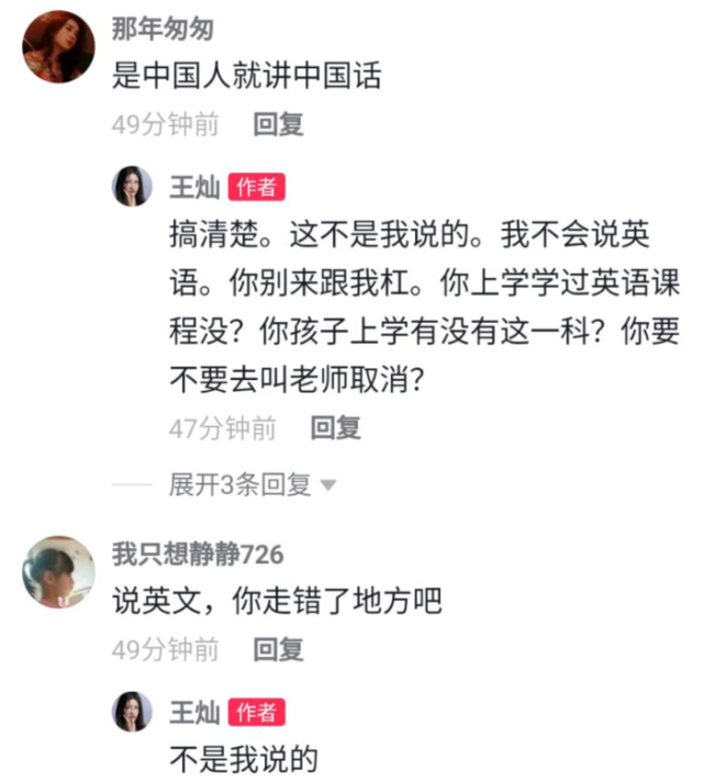 在王灿晒一家三口合照的动态下,不少网友以为背景音乐是王灿说英语便激情开麦:“是中国人就讲中国话”、“说英文,你走错地方了吧”、“中文不好听吗?为什么要讲英文呢”。