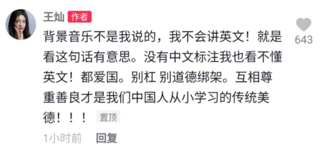 王灿表示:“背景音乐不是我说的,我不会讲英文!就是看这句话有意思。没有中文标注我也看不懂英文!都爱国。互相尊重善良才是我们中国人从小学习的传统美德!”