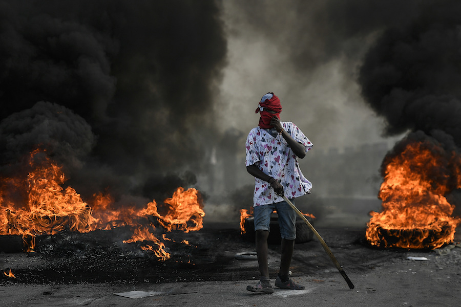 2021年7月22日,海地北部历史古城海地角,当地的群众集会演变为暴力活动,抗议者朝天开枪,投掷石块,掀翻了海岸附近的混凝土路障。