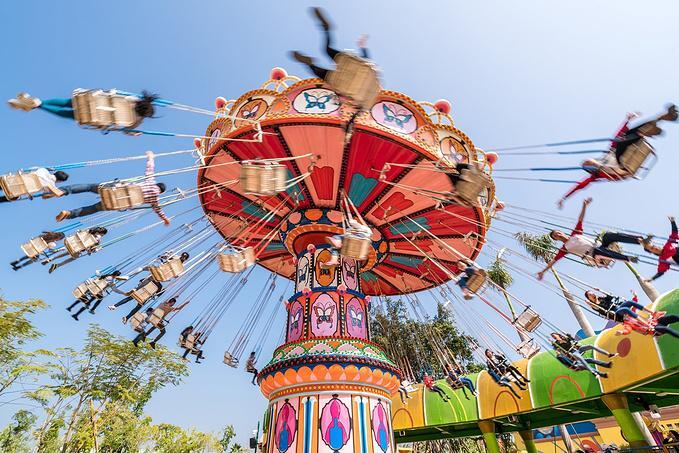 游玩的这个叫“彩蝶翻飞”,是集旋转、升降、变倾角等多种运动形式于一体,外观华丽。座椅在离心力的作用下绕立柱飞翔,呈波浪荡漾状,犹如在空中飞翔、荡漾。