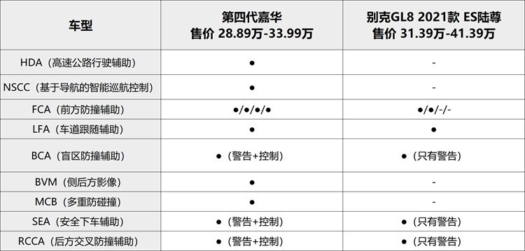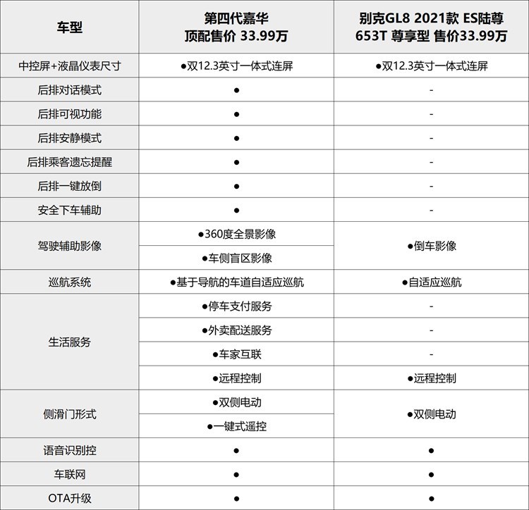 为了更直观地了解第四代嘉华、别克GL8的科技配置,我们依然是直接列表对比: