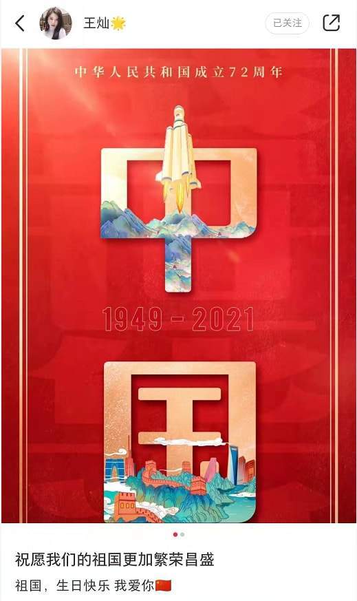 与此同时,王灿还在另一社交平台上分享出了与老公、女儿的合照庆祝,并再次发文:“祝愿我们的祖国更加繁荣昌盛,祖国,生日快乐,我爱你”,令人十分动容。