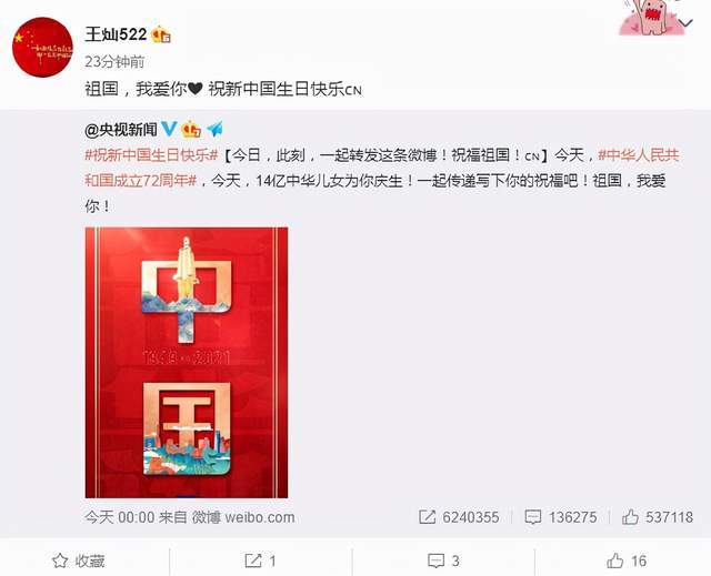 10月1日国庆节,不少明星艺人都纷纷发文庆祝祖国成立72周年,杜淳爱妻王灿也是其中一个。1日一大早,王灿便转发了央视新闻庆祝祖国成立72周年的消息,并激动写道:“祖国,我爱你,祝新中国生日快乐”。不仅如此,王灿还将自己的头像换成了国旗,简直太用心了。