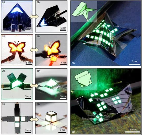 在此次研究出的超薄QLED可以自由自在地折叠。成功制作出了具有蝴蝶、飞机、金字塔等复杂结构的3D可折叠QLED。