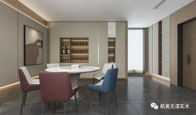 若餐厅面面积较小摆不下酒柜,而旁边又正好有非承重墙,那么就可以考虑砸墙装入墙式酒柜,这样不占用实际面积也能挤出酒柜收纳,空间利用非常的巧妙。