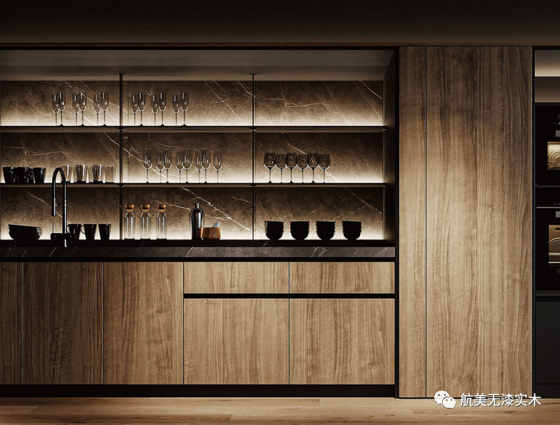 “鸡肋”死角被有效利用,形成转角区域那个大容量收纳隔层。增加灯光格调之效,把美酒放置在这样地方,家里岂不更美了!